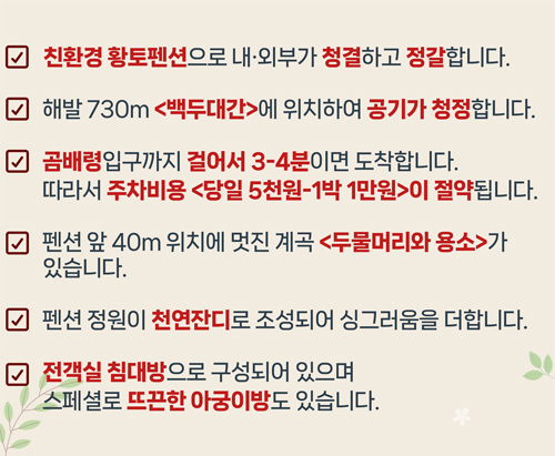 뜨락 삼아 곰배령 해발 730m에 위치한 황토펜션입니다.